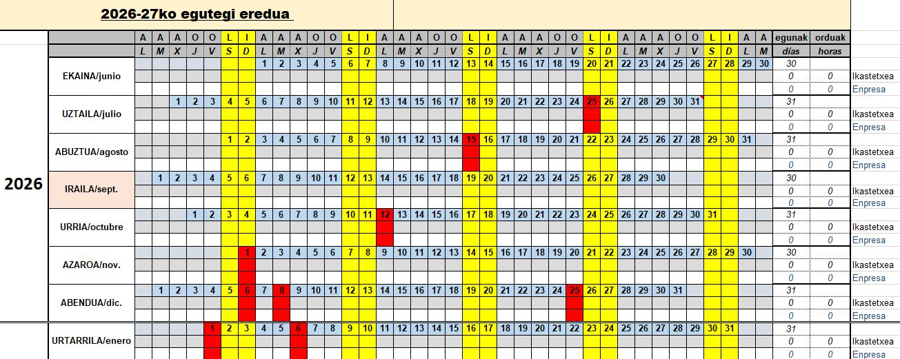 Egutegiaren simulatzaile hau L.H.ko ikastetxeen eskutan jartzen da, ikastetxe eta enpresen arteko txandakako denbora eta egutegia kalkulatu dezaten. Deskargatu 2026-27ko [...]